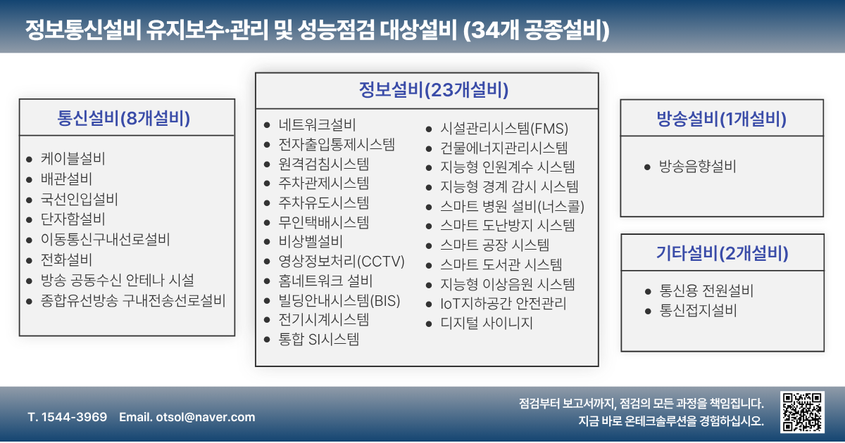 방송설비·통신설비·정보설비·기타설비 등 총 34개의 설비를 체계적으로 성능 점검합니다.